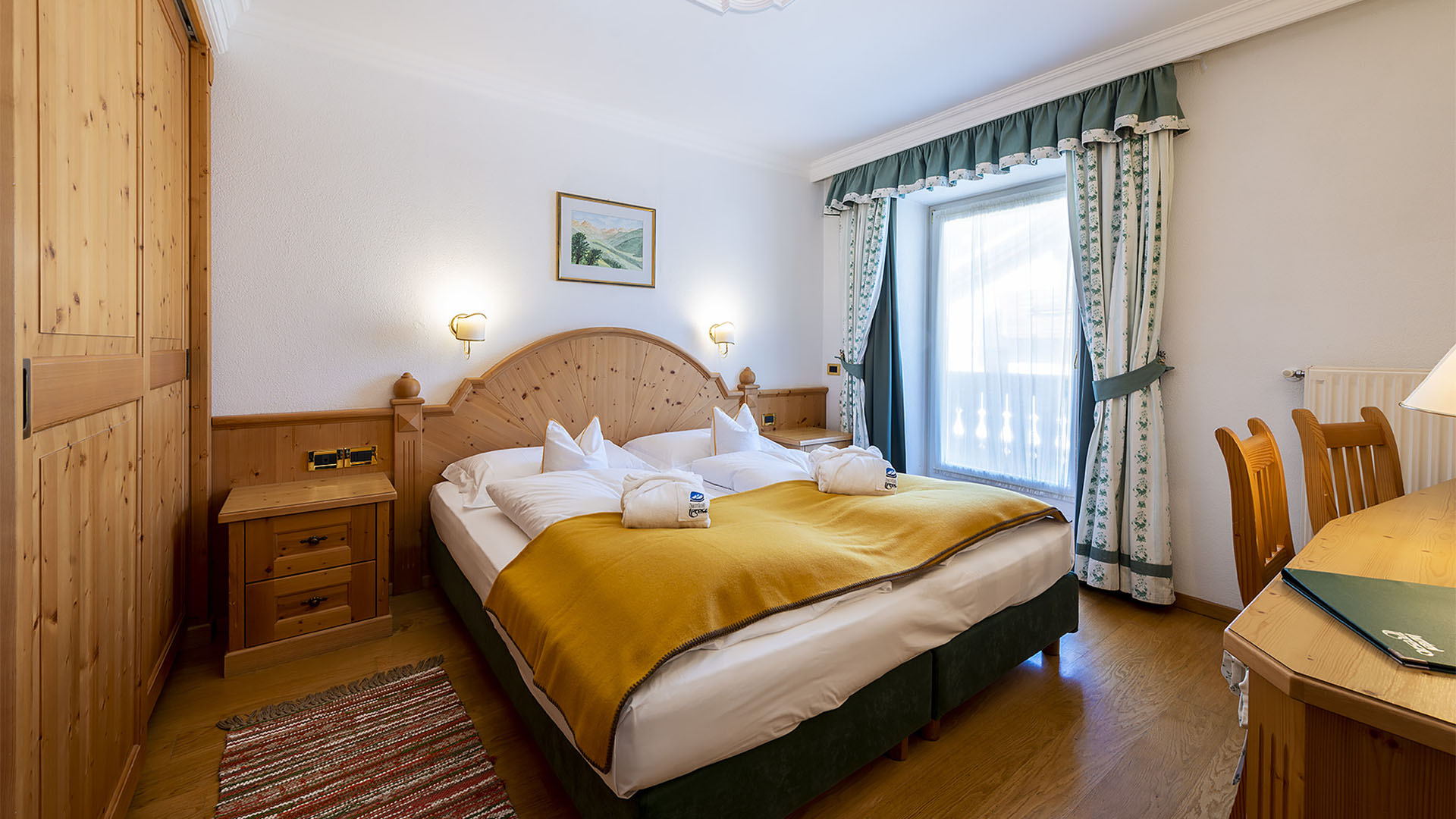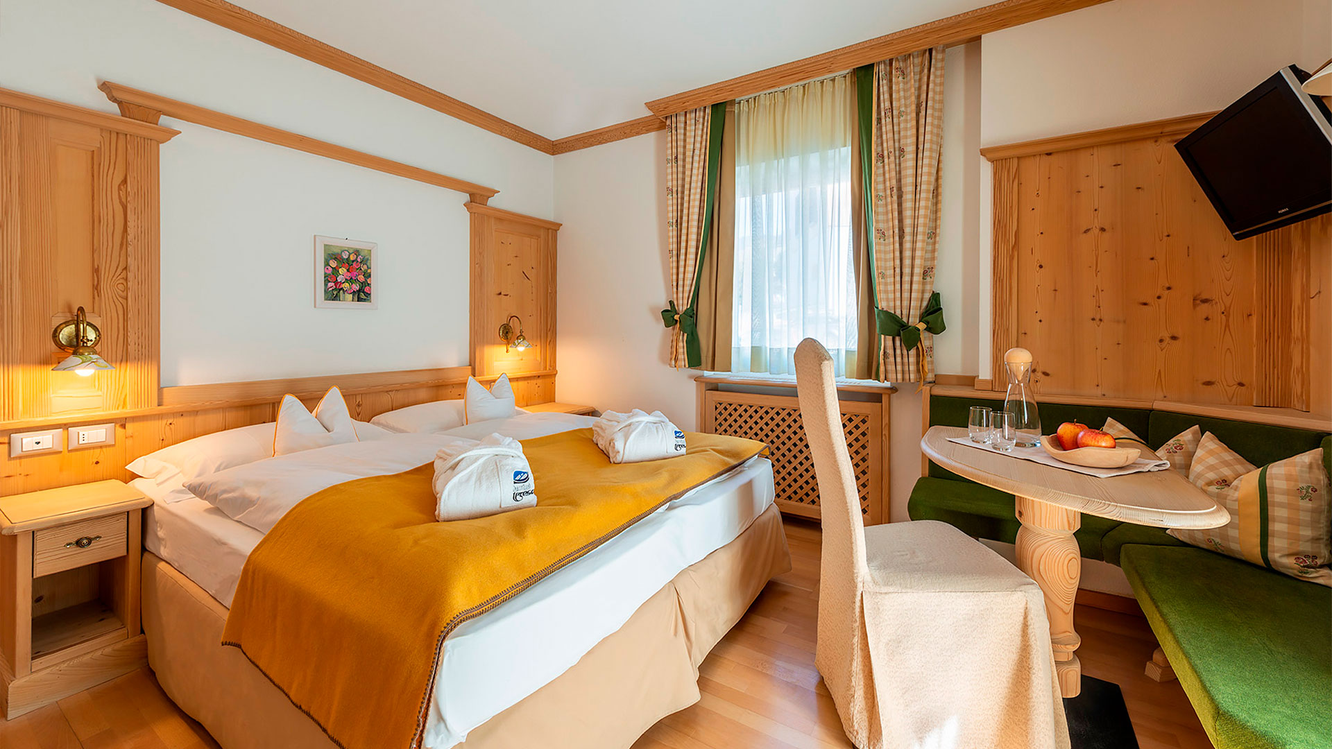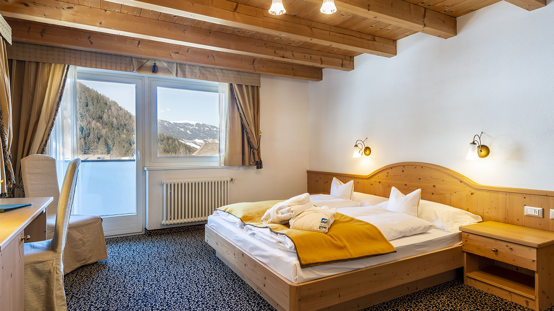 Sleeping at Hotel Teresa, Dolomites accommodation in San Vigilio di Marebbe, will be more pleasant than ever in the mountain rooms: bright environments, simple and elegant furnishings with an Alpine flavour with all the unmistakeable warmth of wood. The Pine (Pinus sylvestris), larch (Larix decidua) and Swiss Stone Pine (Pinus cembra), which make up the decor, all come from local and sustainable forests.