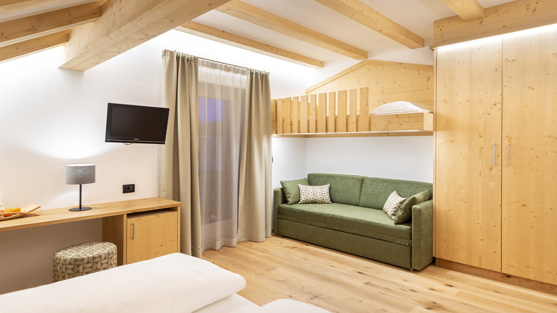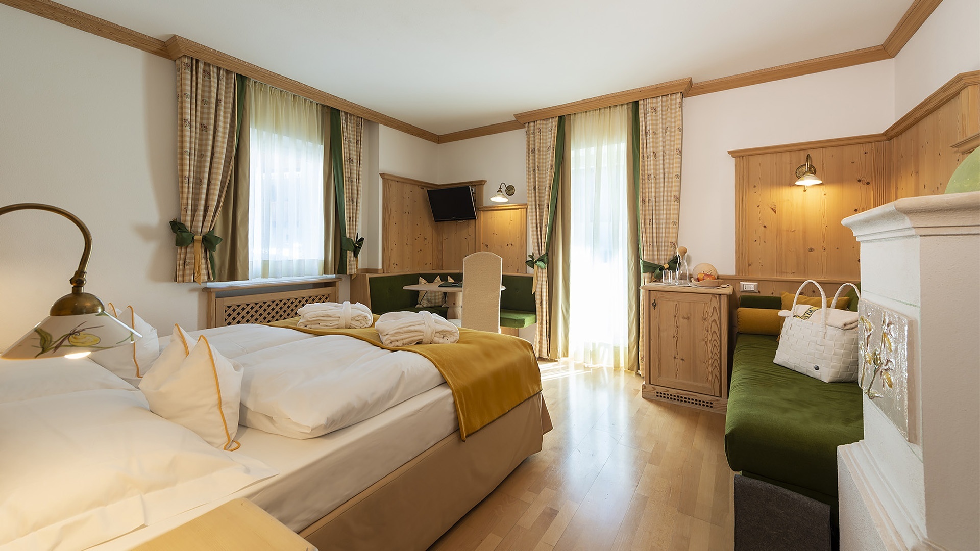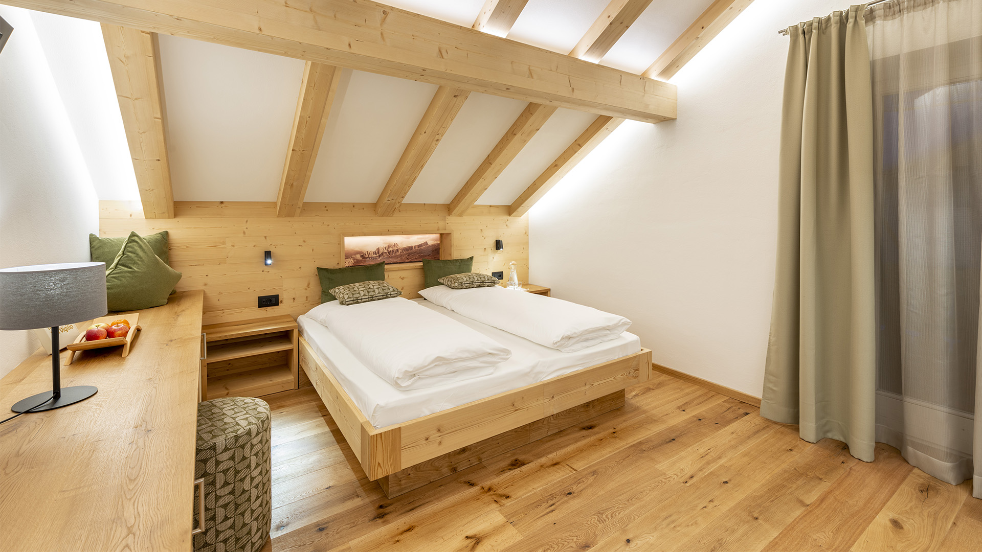 Sleeping at Hotel Teresa, Dolomites accommodation in San Vigilio di Marebbe, will be more pleasant than ever in the mountain rooms: bright environments, simple and elegant furnishings with an Alpine flavour with all the unmistakeable warmth of wood. The Pine (Pinus sylvestris), larch (Larix decidua) and Swiss Stone Pine (Pinus cembra), which make up the decor, all come from local and sustainable forests.