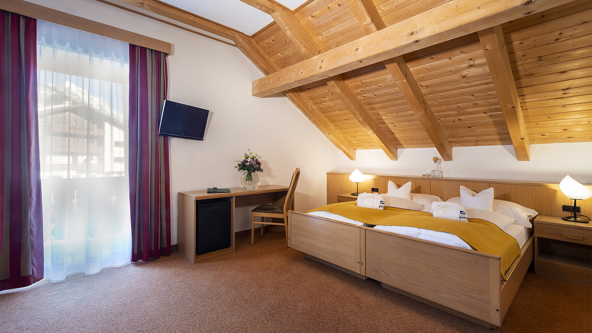 The FANES rooms are our most spacious rooms and offer the greatest comfort. Made of fir, larch or pine wood, they create a pleasant and relaxing atmosphere. The FANES room do have a balcony or a terrace some of them have parquet pavement others are with moquette. They are equipped with satellite TV, telephone, hairdryer, bathroom with bathtub or shower, mini fridge and safe.