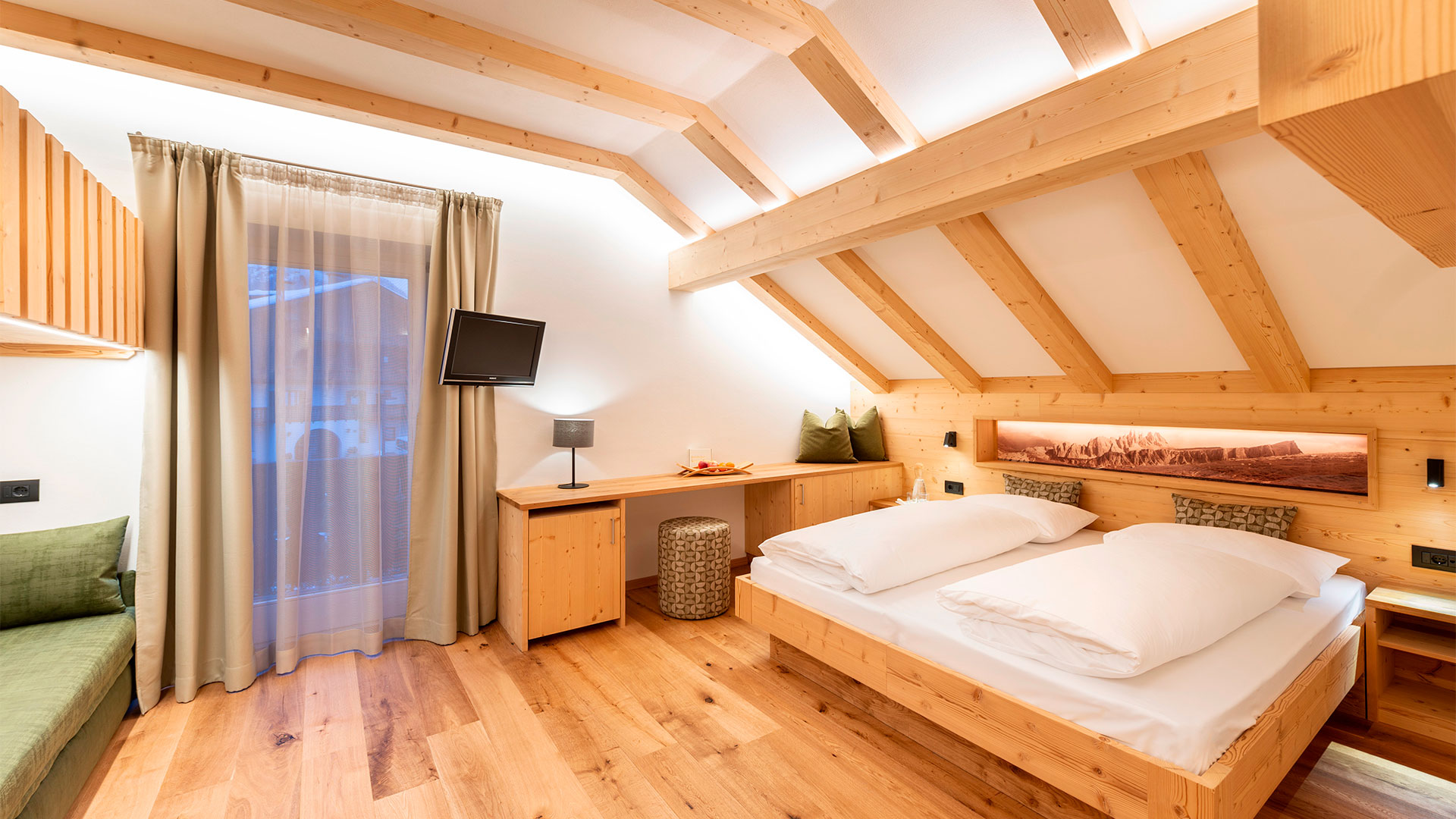 Gli ambienti caldi, i materiali naturali e l’atmosfera di gioviale intimità creata grazie ad una gestione famigliare, rendono il nostro hotel un luogo accogliente con spirito ladino.